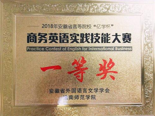 5月26日,2018年安徽省“亿学杯”商务英语实践技能大赛在淮南师范学院圆满落幕。此次大赛由安徽省外国语言文学学会主办,淮南师范学院承办,共吸引了省内18支开设商务英语专业或方向的本科院校代表队参加。经过一天的紧张角逐,我校九游·官方网站陈欣月、陈诚、孙淑琦三位同学组成的代表队荣获团体一等奖。