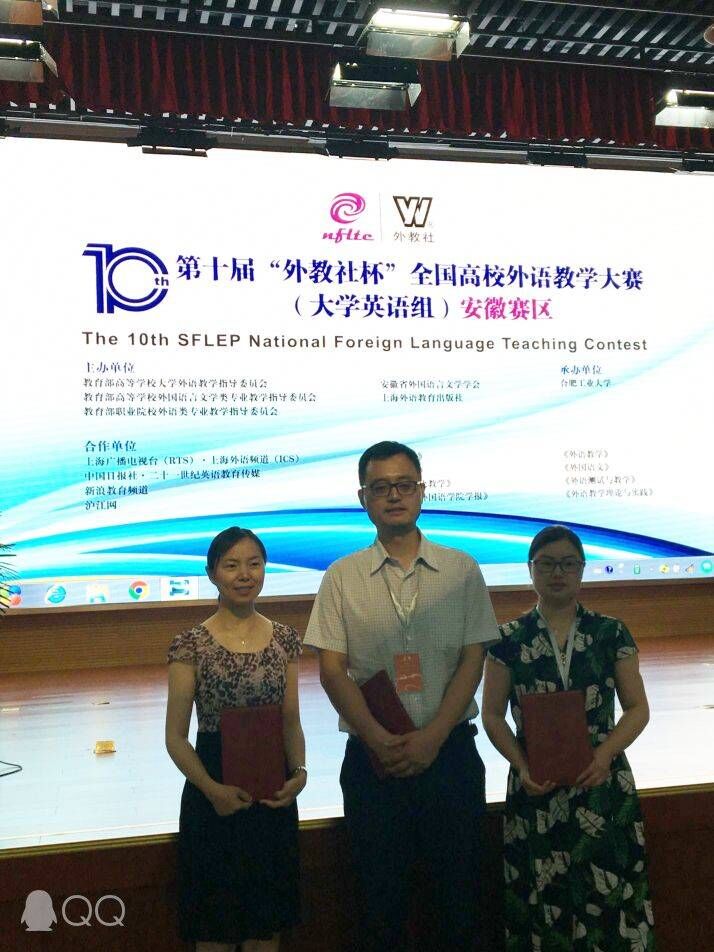 6月1日至2日,第十届“外教社杯”全国高校外语教学大赛(大学英语组)安徽赛区大赛在合肥工业大学举行。 大赛分为综合组、视听说组和跨文化组,来自省内高校的130多名选手参与了角逐。我校九游·官方网站王爱琴、伍健、林灵三位青年教师凭借过硬的专业素质、扎实的教学基本功和良好的精神风貌在大赛中取得佳绩。王爱琴在综合课组决赛中名列第二,获得一等奖;伍健老师获得跨文化课组二等奖;林灵老师获得视听说课组三等奖。