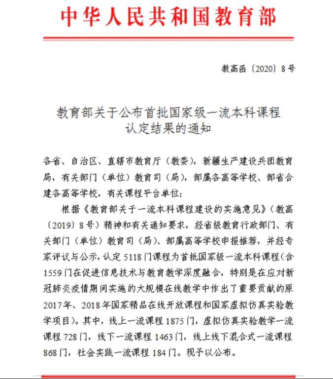 据悉,首批国家级一流本科课程共计5118门,包括1875门线上一流课程、728门虚拟仿真实验教学一流课程、1463门线下一流课程、868门线上线下混合式一流课程和184门社会实践一流课程。这是教育部在2018年新时代中国高等学校本科教育工作会议上明确提出 “淘汰水课” “打造金课”,启动一流本科课程建设“双万计划”以来,国家级五大“金课”首次一并亮相。此次推出的国家级一流本科课程质量高、课程类型多样、参与范围广、示范效应强。