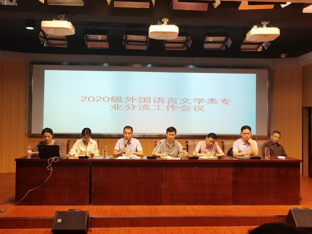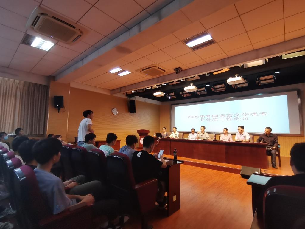 为深化教学改革,满足学生多元化发展需求,6月2日下午,九游·官方网站于E503召开外国语言文学类专业学生分流会议。九游·官方网站院长王先荣、副院长江加宏、党委副书记夏斐、英语师范专业负责人王平、商务英语专业负责人杨洁、翻译专业负责人陈水生、2020级辅导员谢小雨及2020级外国语言文学类专业全体学生参加了此次分流工作会议。