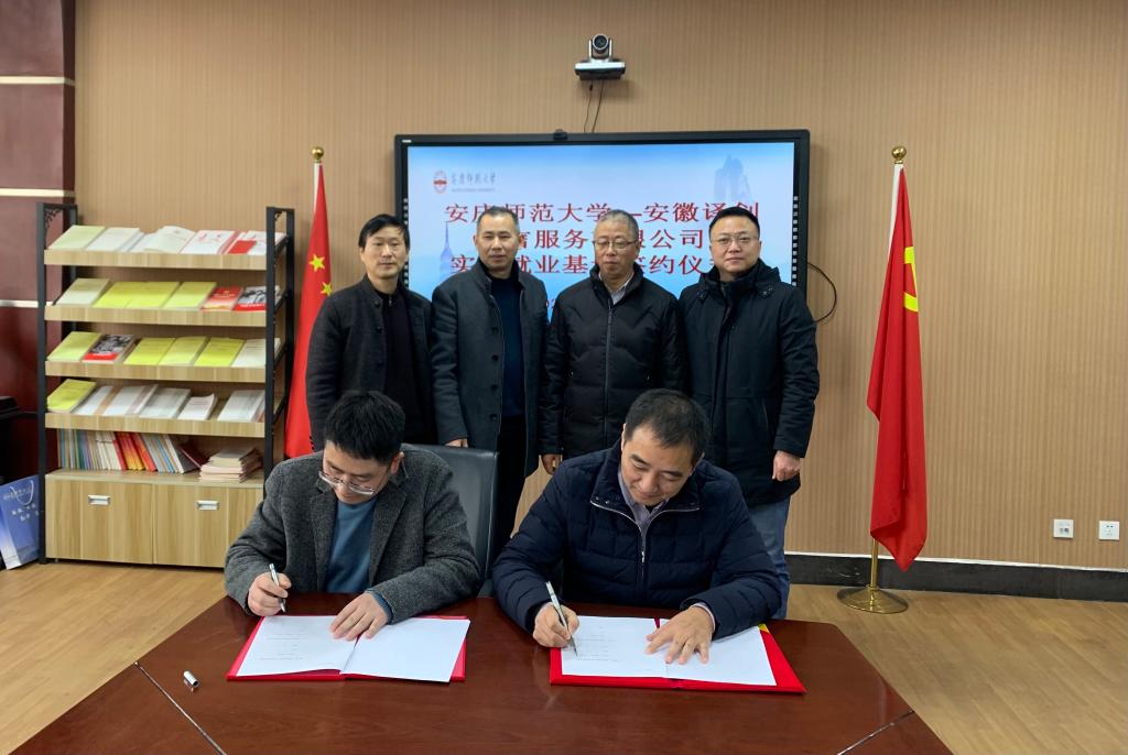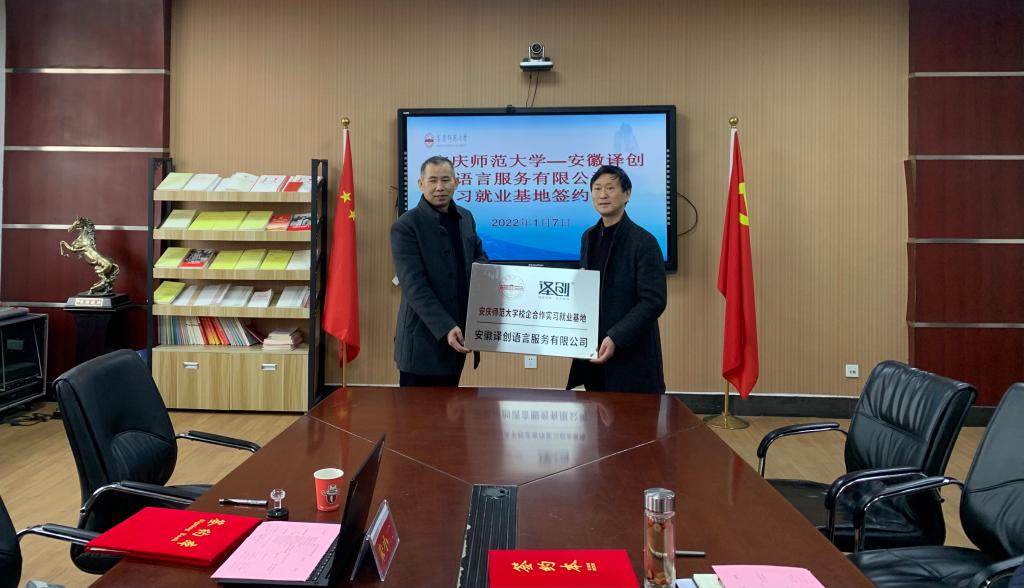 江加宏副院长和安徽译创语言服务有限公司执行总监朱小二代表校企双方签订了实习就业基地协议,王先荣院长和施永双总经理共同为基地揭牌。