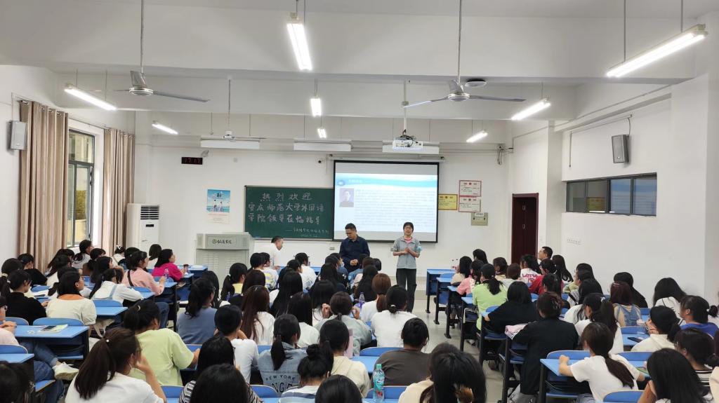 为了提升我院专业硕士点的影响力和辐射力,9月22日-23日,学院副院长黄全灿、硕士生导师代表陈水生、王平、研究生秘书马龙及在校研究生代表一行六人先后奔赴省内四所高校,开展线下招生宣传。宣讲会上,黄全灿全面介绍了我院教学特色、人才培养优势以及研究生招生政策、导师团队、科研成果、以及研究生培养和奖助体系等,帮助考生更好地了解院情。学科硕士生导师王平及翻译硕士生导师陈水生分别介绍了我院两个硕士点的具体优势、特色,并与同学们进行了交流互动,鼓励广大同学做好考研规划,明确考研目标,扎实做好复习迎考工作。