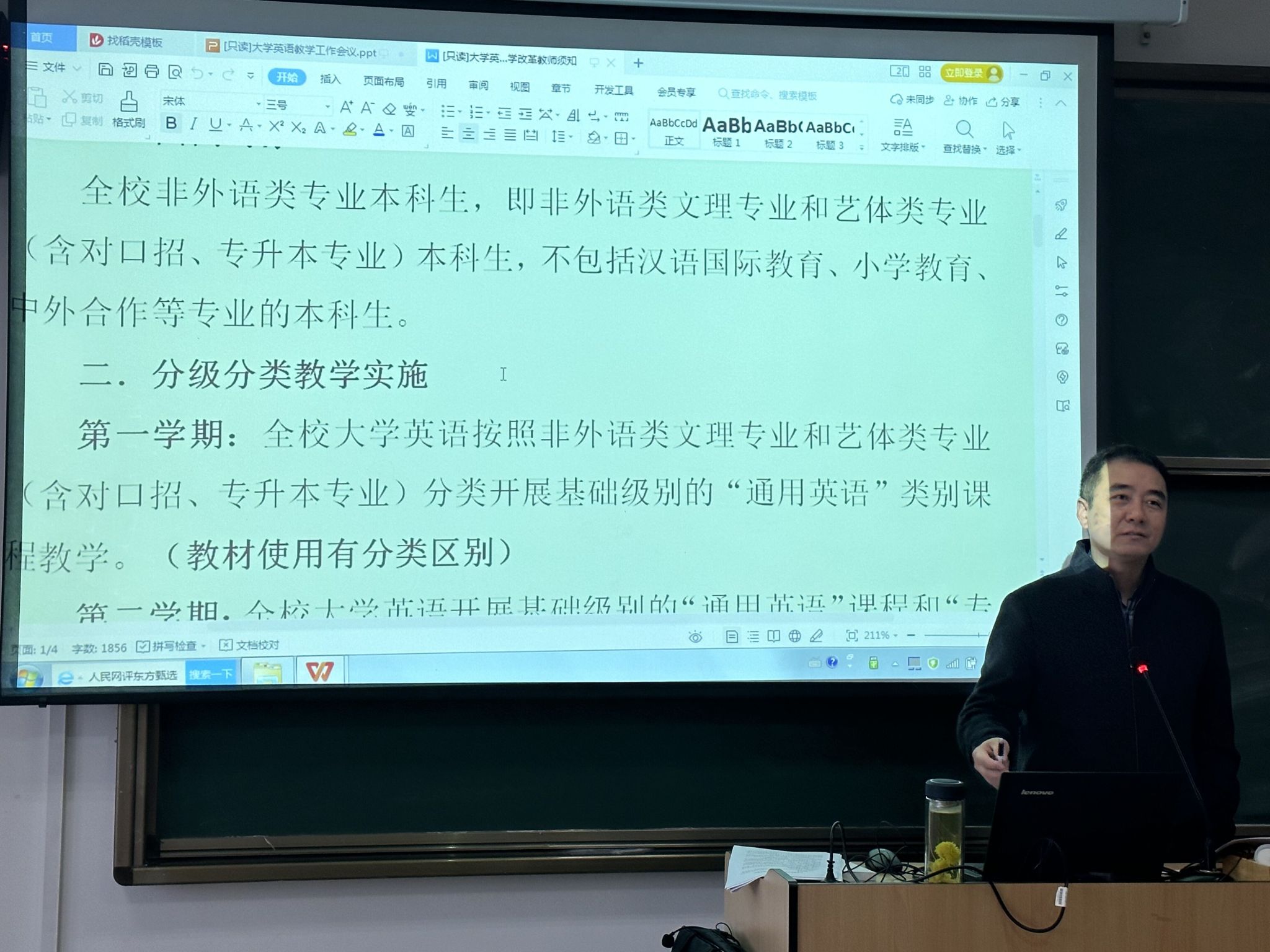 李亦亮指出,安庆师范大学大学英语分级分类教学改革工作正在推进之中,全体大学英语教师要坚定不移地支持大学英语教学改革,坚定不移地提高课堂教学质量,坚定不移地讲规矩、守纪律。教师需要在教学理念、教学方法和教学习惯上更好地适应新形势和新要求,努力做好课程思政教学,严格遵守教学纪律,切实抓好课堂管理,着力提升教学质量,优质服务学校人才培养。