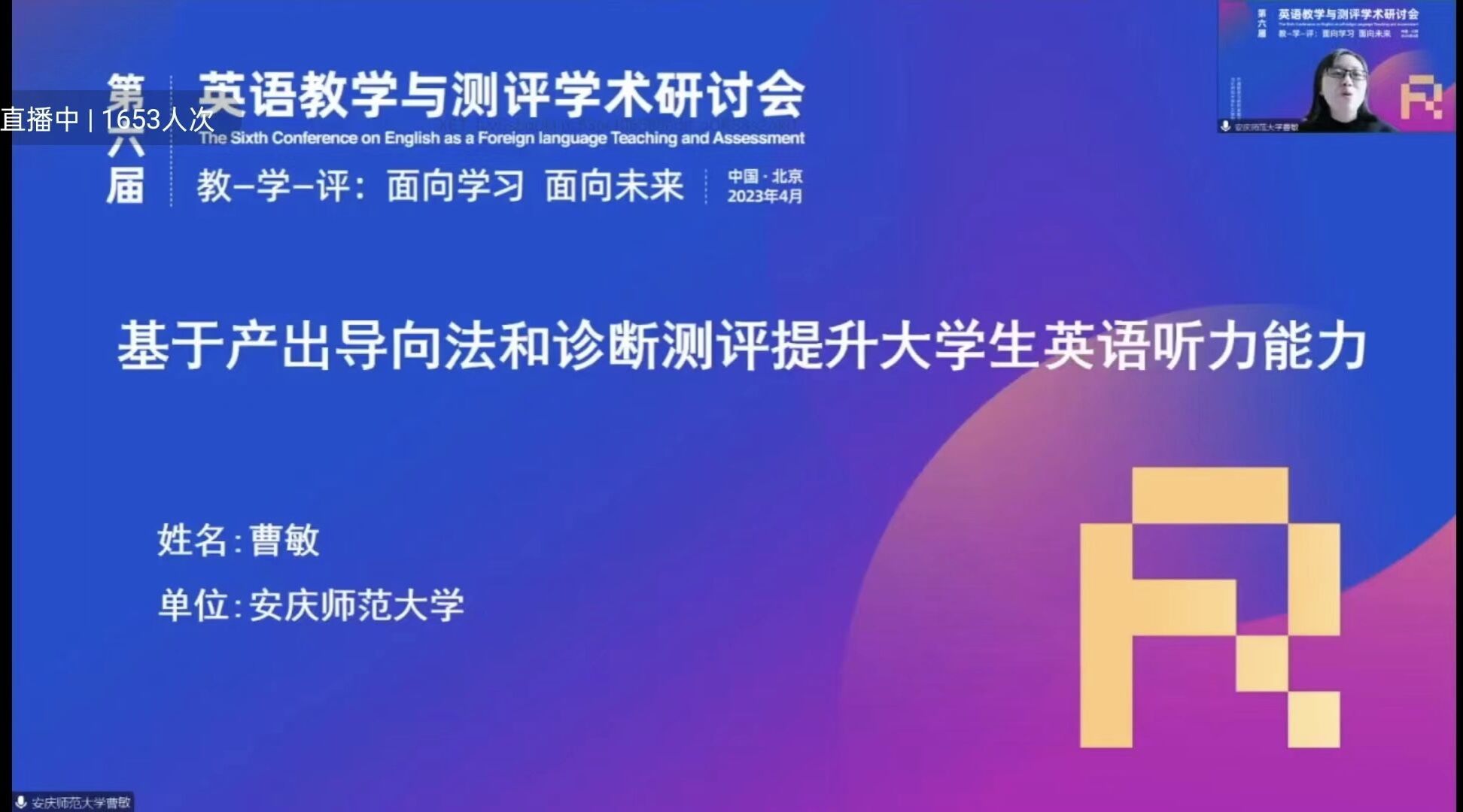 2023年4月7日至8日,由北京师范大学外国语言文学学院、外语教学与研究出版社联合主办的第六届全国英语教学与测评学术研讨会以线上线下相结合的方式成功举办,超9万人次在线参会。九游·官方网站大学英语第一教研室曹敏老师在高校分会场作了“基于产出导向法和诊断测评提升大学生英语听力能力”的“教-学-评”实践案例展示。