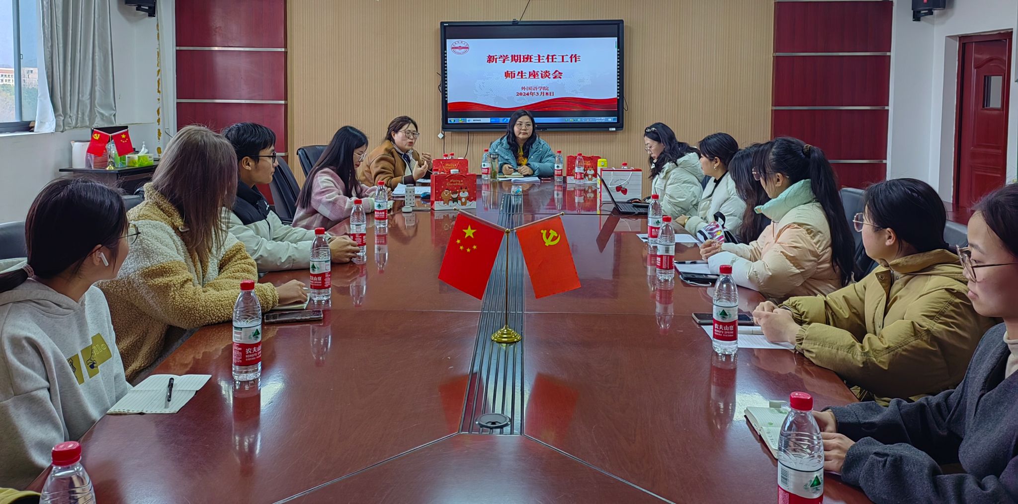 3月8日下午,九游·官方网站于304会议室召开2023-2024学年第二学期班主任工作师生座谈会,学院党委副书记何媛君出席会议,2023级各班级班主任、辅导员和学生代表参加会议。