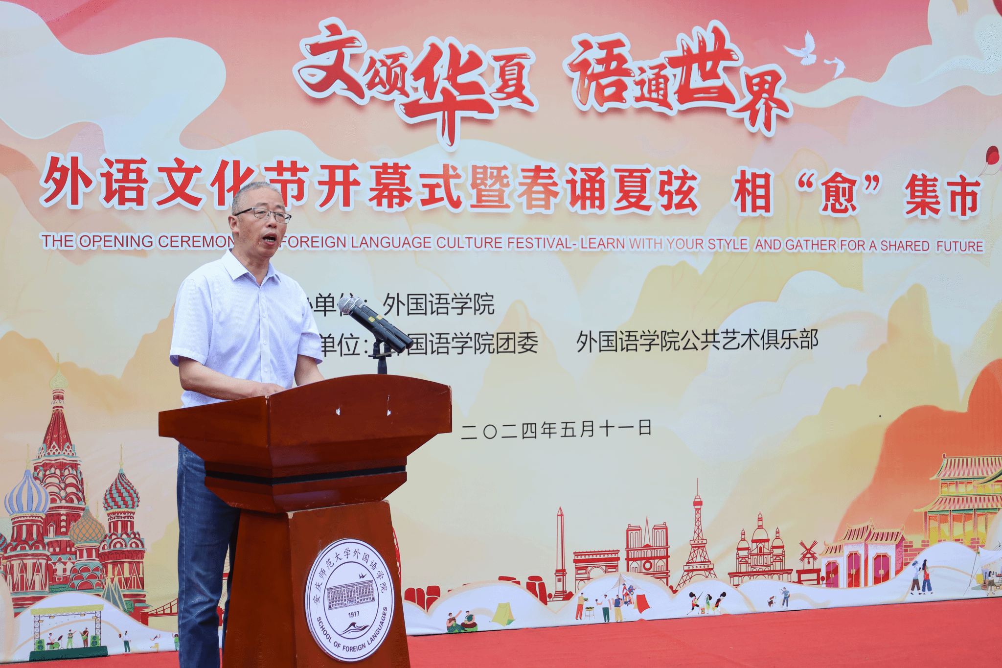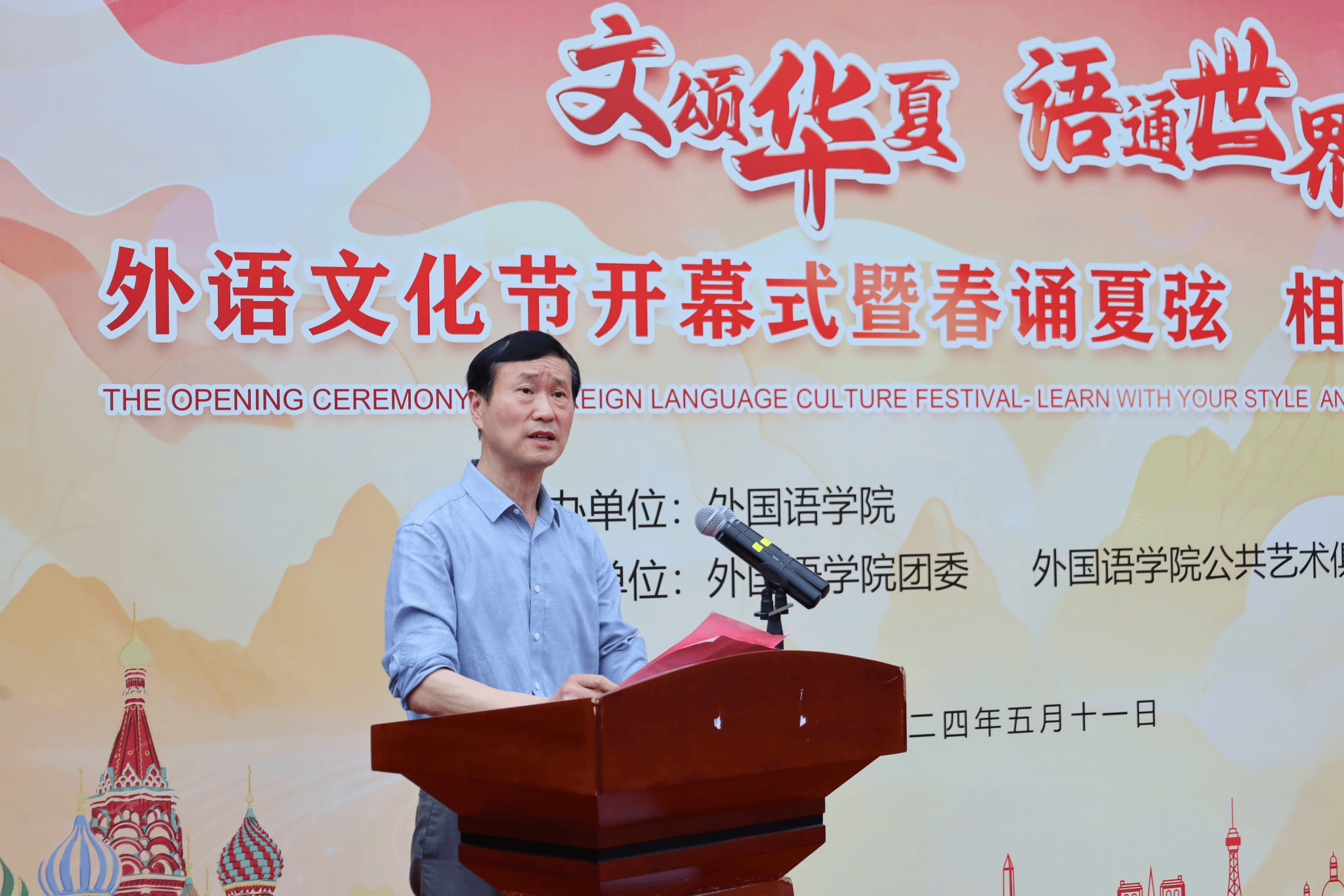 王先荣宣读外语文化节方案,他介绍今年外语文化节的主题是“文诵华夏,语通世界”,并介绍了活动对象、活动重点及活动内容。他指出,外语文化节活动进一步促进了中华传统文化的国际传播,加强文化交流对话,提高了学生综合素质,提升了学院人才培养质量。“2024年外语文化节是讲好中国故事,传播好中国声音的重要平台,是学习贯彻党的二十大精神的实际行动展现。”