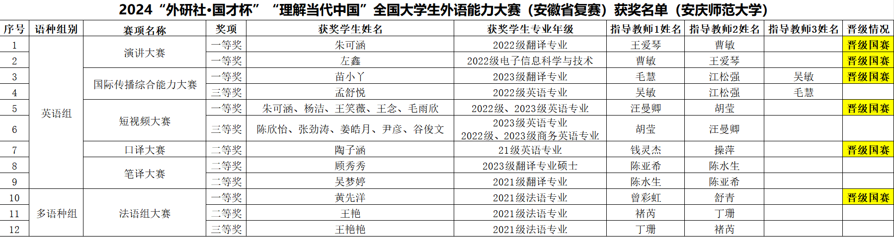 近日,2024年“外研社·国才杯”“理解当代中国”全国大学生外语能力大赛安徽省决赛圆满落下帷幕。我校学子在英语组演讲赛、综合能力赛、口译赛、短视频赛和多语种(法语)赛中共斩获一等奖5项、二等奖4项、三等奖3项。