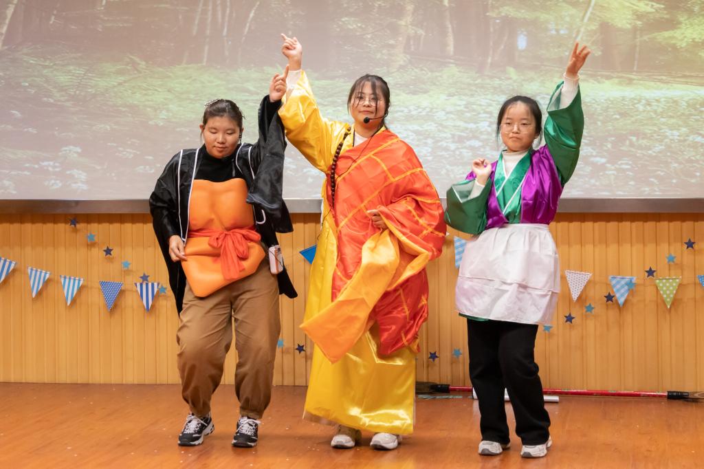 身着华丽宫装,各宫娘娘齐聚舞台,英语专业2021(3)班将电视剧《甄嬛传》搬上舞台,用英语方式全新解读宫廷文化;结合抖音热门视频“广西科目三”,外国语言文学类专业2022(7)班别样演绎《三打白骨精》,再现唐僧师徒取经路上的曲折;男扮女装的白雪公主,女扮男装的王子,外国语言文学类专业2022(3)班的《白雪公主》以独特的性别反串方式给观众留下深刻印象……精彩的表演,流利的口语,让不少观看的学生大呼“简直是视觉与听觉的双重享受”,部分学生在观看中也不忘用手机录制视频,分享给家人朋友欣赏。