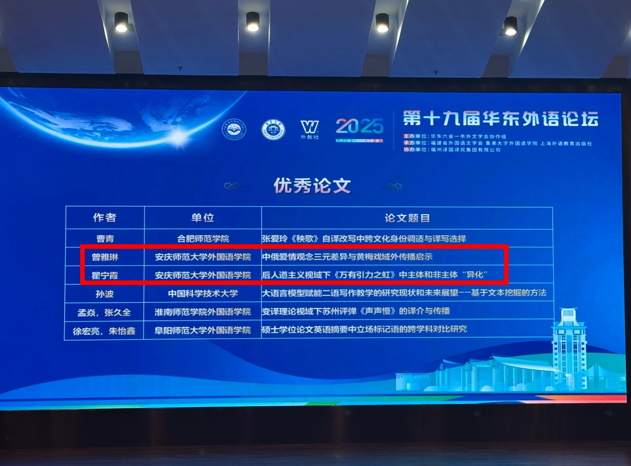 论坛期间,我院4名参会教师紧扣国别与区域研究、外国文学、外语教育学等方向,分别在各平行分论坛作专题汇报,并与现场专家学者围绕研究热点、学术难点展开深度研讨。其中2名参会老师的投稿论文获评本届论坛“优秀论文”,并入选《华东外语论坛》(第17辑)。