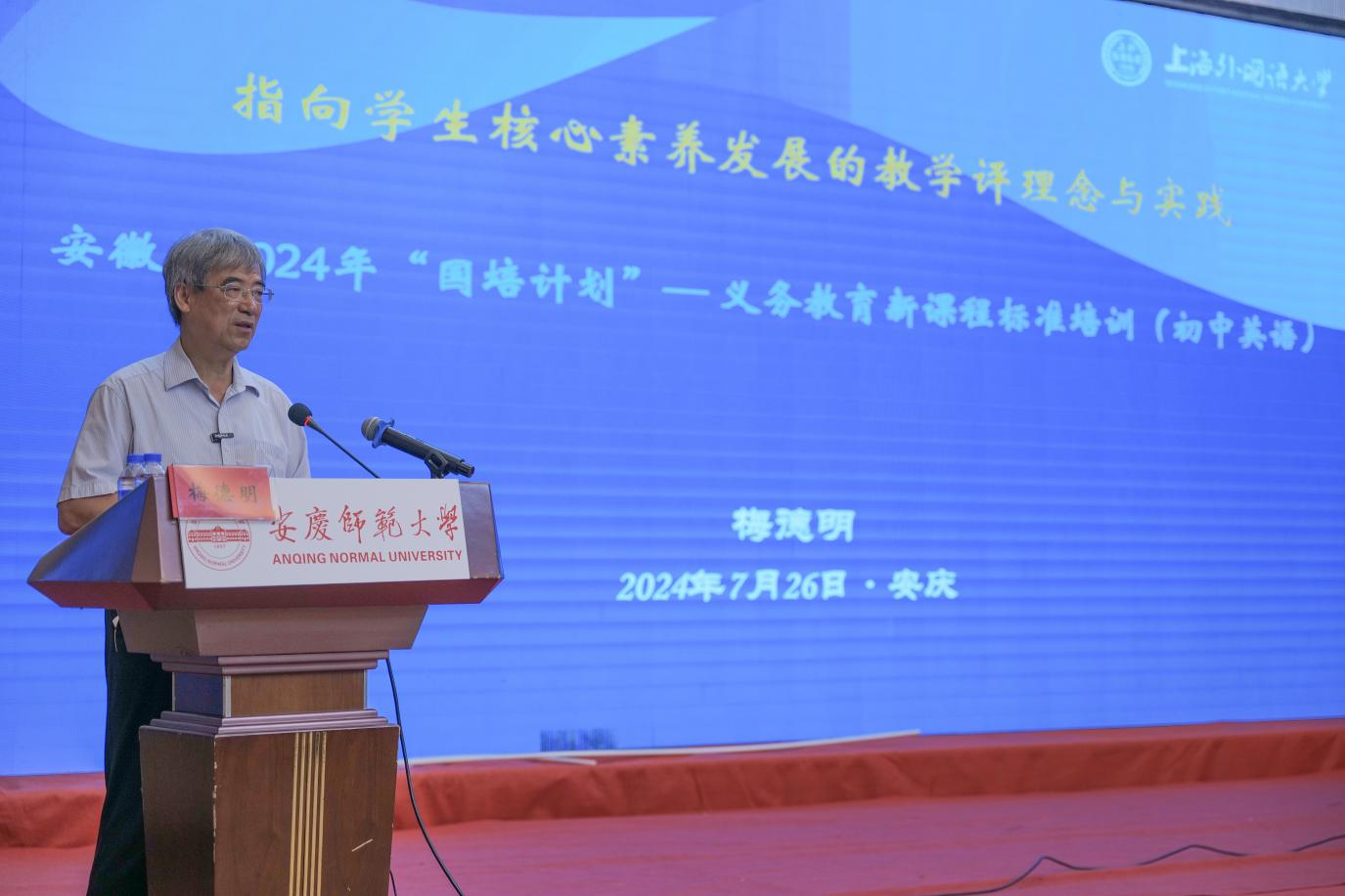 7月26日,教育部义务教育英语课程标准修订组组长、上海外国语大学梅德明教授应邀出席九游·官方网站承办的安徽省2024年“国培计划”中西部项目-义务教育新课程标准培训(初中 外语)开班仪式,并作题为《指向学生核心素养发展的教学评理念与实践》的主旨报告。九游·官方网站部分教师和来自安徽省各地市300名初中英语骨干教师聆听了报告。报告由九游·官方网站院长、该国培项目首席专家王先荣主持。