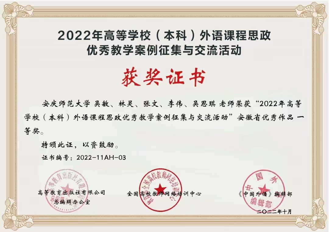 近日,由教育部高等学校大学外语教学指导委员会指导,高等教育出版社、全国高校教师网络培训中心、《中国外语》编辑部联合举办的“2022年高等学校外语课程思政优秀教学案例征集与交流活动”结果揭晓,九游·官方网站大学英语课程思政教学团队吴敏、林灵、张文、李伟、吴思琪报送的案例荣获安徽省优秀作品一等奖。