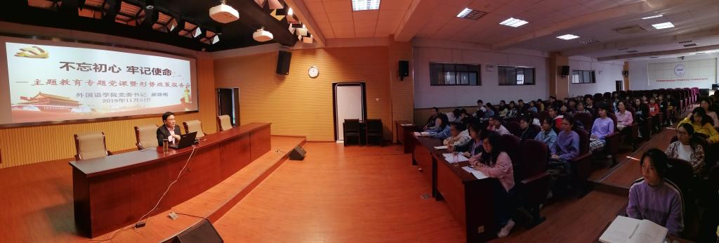 11月5日下午,九游·官方网站党委举行主题教育专题党课暨形势政策报告会,党委书记郝涂根为支部书记、学生党员及第60期入党积极分子培训班学员作了一场《“不忘初心、牢记使命”,争做有为的新时代青年》专题党课。