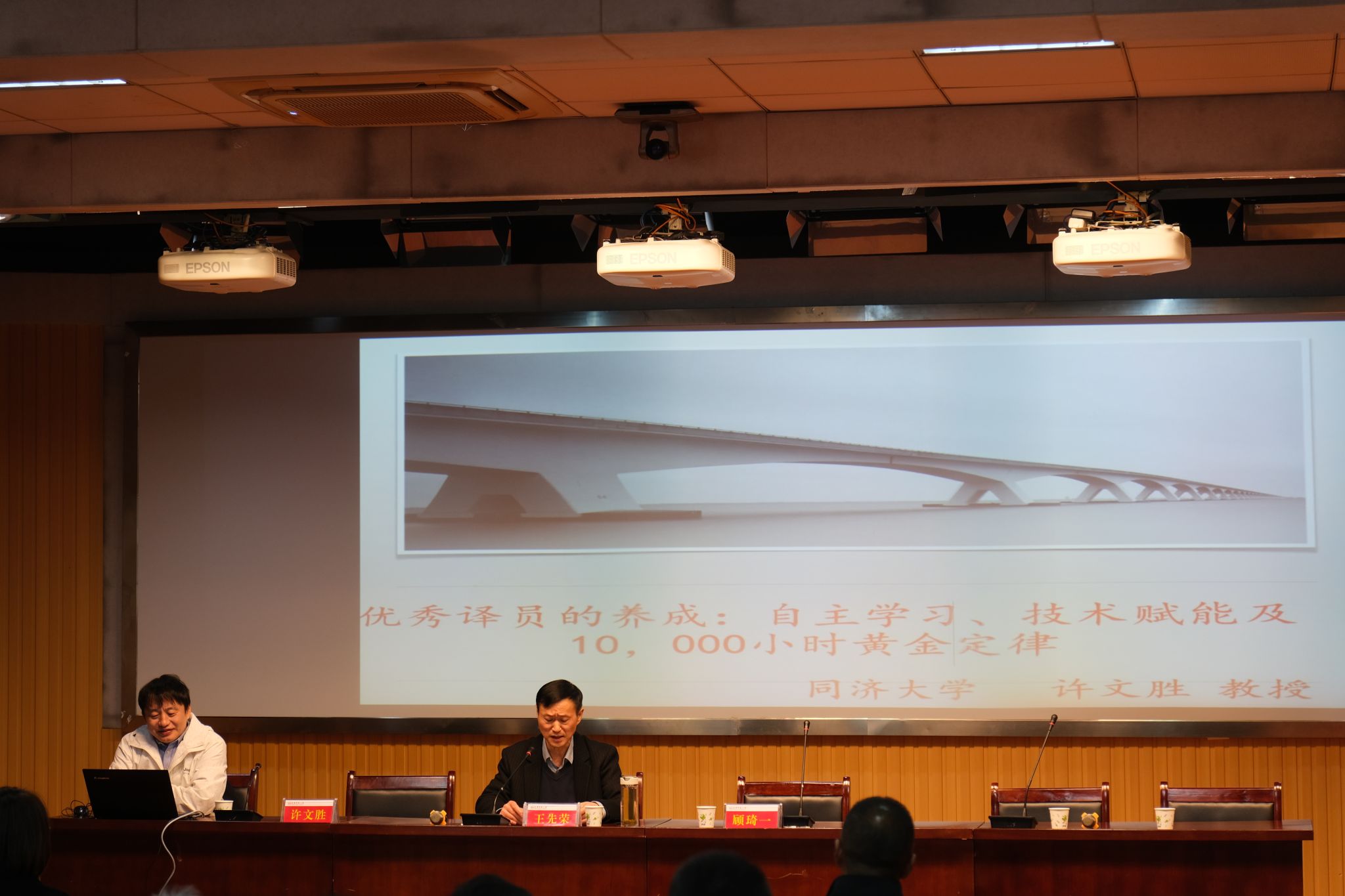 11月29日下午主题报告环节,同济大学许文胜教授作题为《优秀译员的养成:自主学习、技术赋能及10,000小时黄金定律》的报告。许文胜教授在分析UN、EU等机构职业译员招聘的资格与能力要求、对标AIIC职业译员素质要求的基础上,结合中国口译教学实践,介绍了译员自主学习模型,列举译员应当所具备的资格和能力要求,提出了可行性教学原则。他特别强调,要成为一名优秀的译员,必须通过自主学习检验自身的听说读写能力,并在口译学习过程中全面提升综合语言能力。他还强调,在人工智能时代,应积极学习和应用技术,提高科学学习意识,通过技术赋能翻译教学实践;同时,学会优化学习策略,整合优质学习资源,践行10000小时的黄金定。最后,他针对如何学习、如何提高能力,提出了众多宝贵的建议,对翻译教学和实践具有非常重要的指导意义。