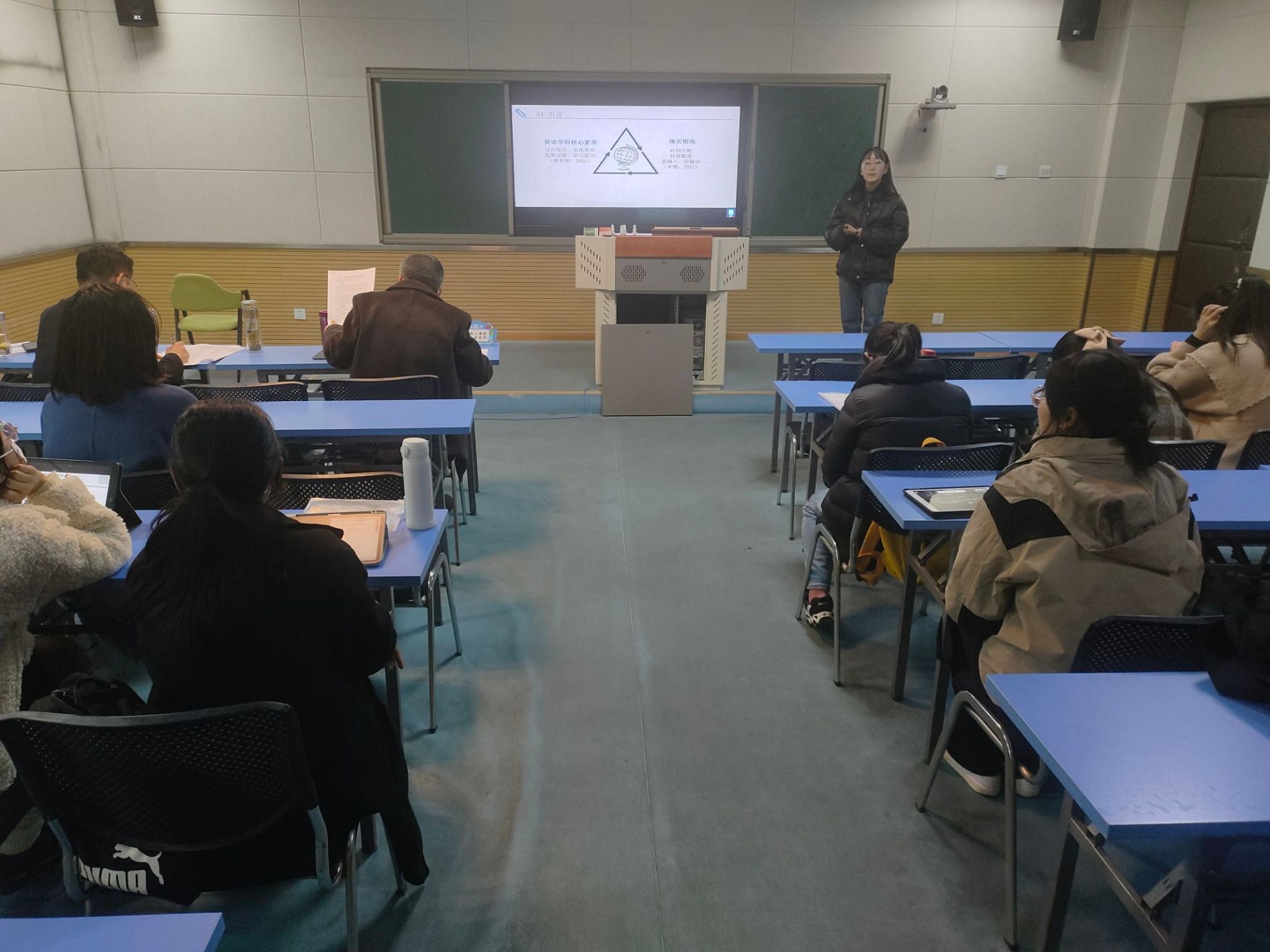 江南大学顾琦一教授作题为《英语课程“教-学-评”一体化:理论与实践》的主旨报告。顾琦一教授结合最新义务教育和普通高中英语课程标准,阐述了‘教-学-评一体化’的内涵与特征,指出核心素养作为关键概念对教学、学习和评价活动提出了新的要求。在教学中,目标是课程教学的支点,而评价则贯穿教学始终以促进目标的达成。教师要把评价贯穿于教学之中,在课前、课中、课后依据核心素养目标进行相应的诊断性评价、过程性评价和终结性评价,发挥评价在改善教学、提升教学质量上的作用,通过“教-学-评”循环发展,螺旋式落实核心素养目标。她结合亲身实践和详实案例为在场的研究生同学和老师上了一堂生动的教学案例课。