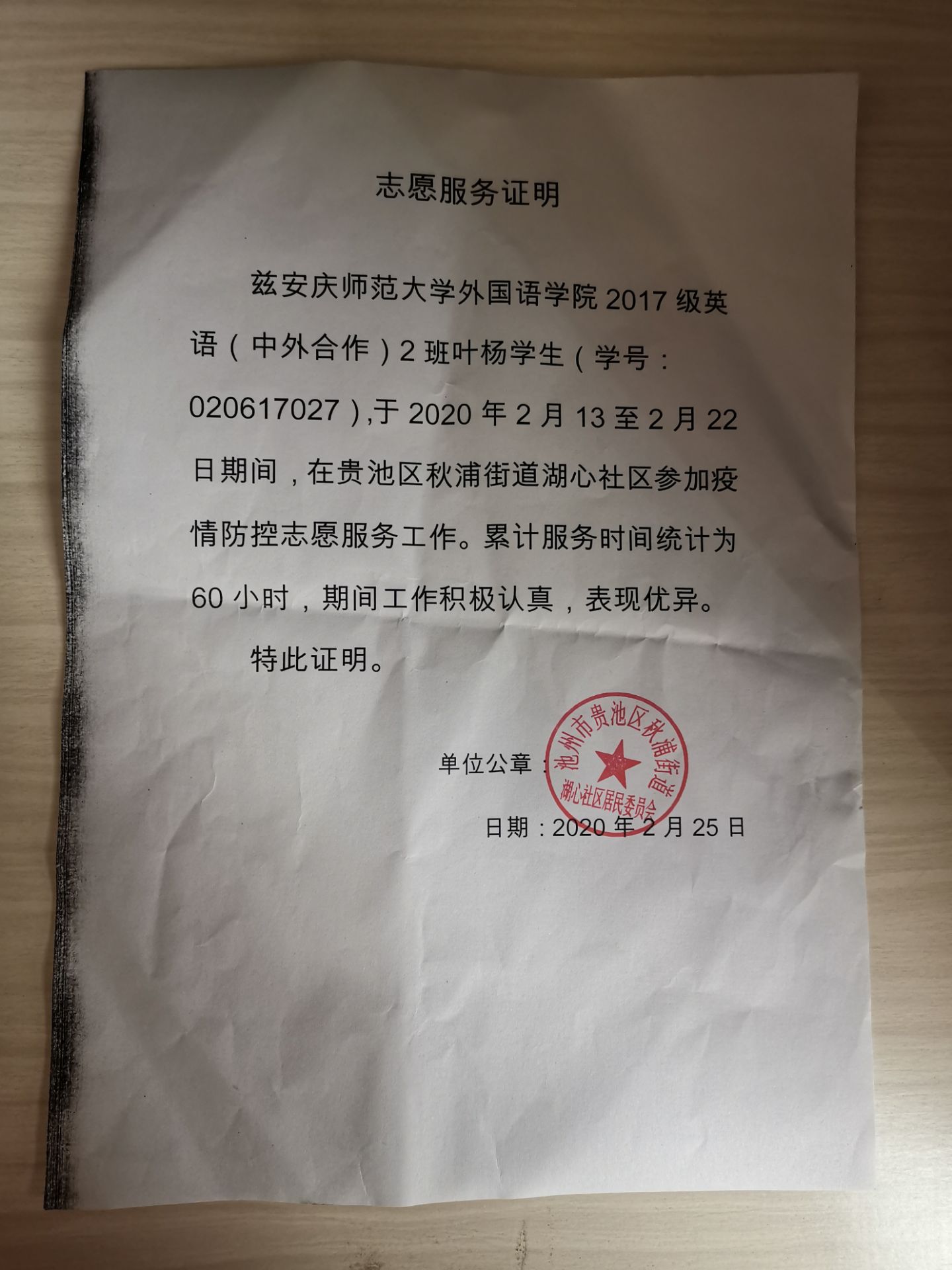 响应村干部号召,2019级商务英语专业的张灵志愿参与防疫工作。在2月15-16日于黄山市休宁县霞阜村桥头协助基层干部进行出入人员登记和车辆登记、搭建帐篷、分发口罩和协助整理政府文件等工作。张灵是第一次参加社会志愿服务活动,他表示:“很累但是很自豪,身为一名大学生,一名入党积极分子,在国家有困难的时候站出来,尽自己的一份绵薄之力是我的职责。”