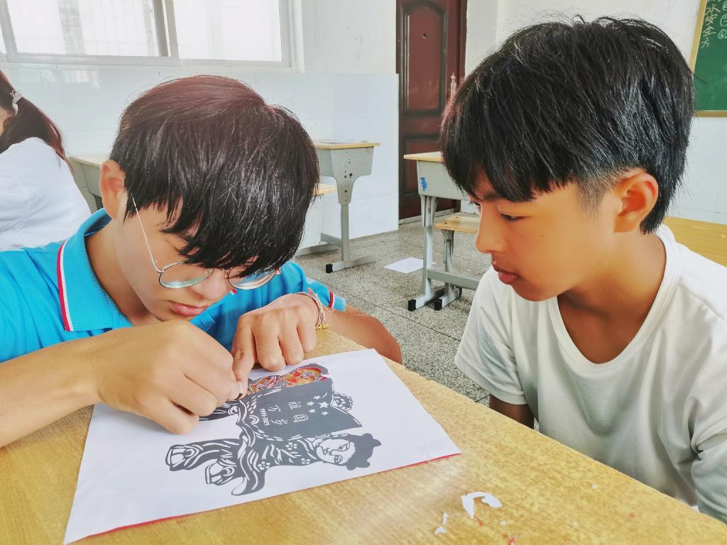 学生檀建宇的父亲是一名扶贫干部,父亲为群众奔走效劳的模样给他留下深刻印象。瞄准边线、细致刻画、打磨细节,檀建宇趴在课桌上刻着“堂堂正正做人,实实在在办事”字样的剪纸作品。檀建宇说:“我要像爸爸学习,成为一个为人民服务的人,为国家建设做贡献。”