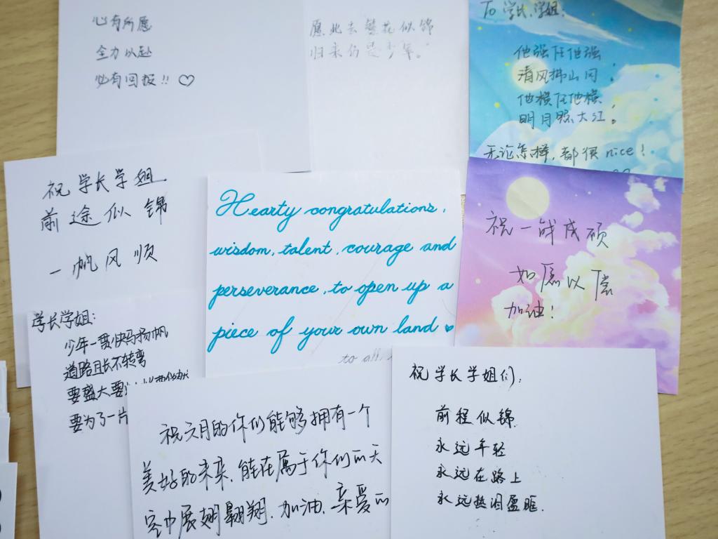 中外名著、教辅资料、科幻杂志……随着活动的开展,驻足参加捐书的学生越来越多,设点处桌子上的书本也越摞越高。贴合“毕业季”背景,读书园还专门设置了一块留言展板,上面贴满了前来捐书的学生们对即将毕业的学长学姐们的美好祝愿。