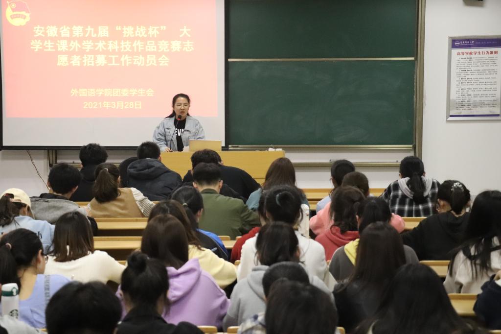会上,莫文逸首先介绍了“挑战杯”大学生课外学术作品竞赛的基本情况,告知与会人员第九届“挑战杯”省赛决赛在我校举行。接着从学校、学院和个人三个层面,阐述了参加志愿服务工作的重要性,提出参与志愿服务队不仅对提升安庆师范大学的知名度和影响力有极大的帮助,同时还能够展现学院风采和提高个人能力。