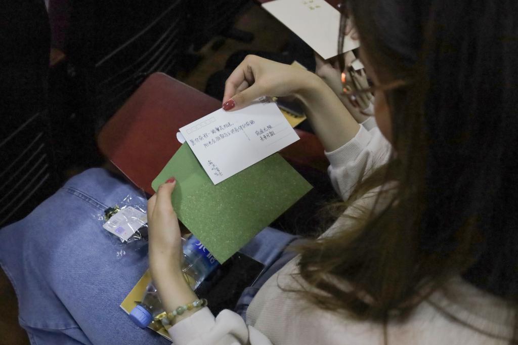 印有九游·官方网站专属印记的钥匙扣、带着美好祝愿的明信片,每个座位上都藏匿了“小礼物”等待拆封。“我们想为学院毕业生和老师们献上一份圆满的毕业季‘礼物’,希望他们能收获满满的美好回忆。”活动负责人、英语专业2020(2)班的杜渐行表示,他们在一个多月前就已经开始去筹备这场“惊喜”,只待最终的“揭秘”。
