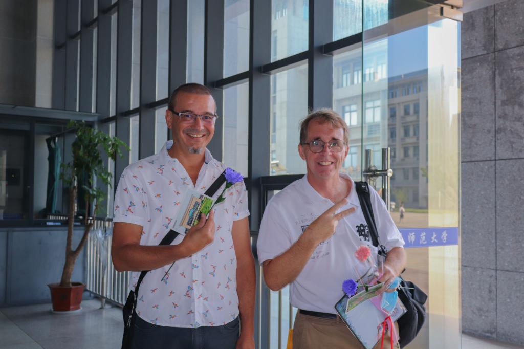 “在我们国家不是非常重视教师节,在这里我感觉中国学生非常热情。”这是外教老师Simon过的第三个教师节,他在收到小惊喜后连连赞叹,主动与分发礼物的学生合影留念。他表示,非常感谢学生们的小礼物,康乃馨和玫瑰花都很精致,学生们还细心得用英语写了祝福,希望学生们好好学习,每天进步一点点,提高自己的学习能力。