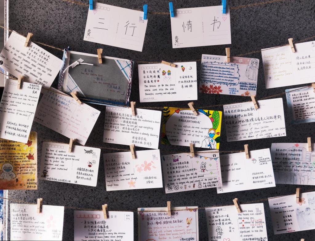 “为希望,为平安,为不久将来的万家灯火。”走入九游·官方网站,印入眼帘的便是张贴着“三行情书”优秀作品的海报,上面张贴的明信片诉尽了学生们对疫情期间医护工作者的感恩和赞美之情。
