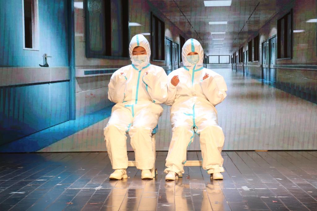 小品《Epidemic Situation》以新冠肺炎疫情为背景,介绍了一位感染新冠肺炎的学生,在志愿者和医生的帮助下得到治疗的故事。节目展现了疫情蔓延时人们艰难的生活状况,塑造了不畏艰险、奉献付出的医务工作者形象。“我们想通过这个节目来致敬、感恩坚守在抗疫一线的医务人员和默默奉献的志愿者。”英语专业2020(8)班的章子若在表演完节目后说。