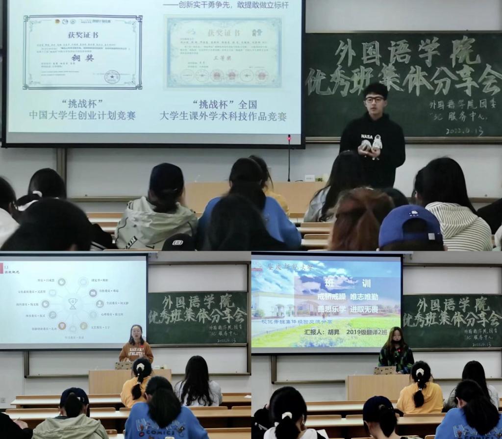 为进一步发挥优秀班集体的引领示范作用,提升班级凝聚力,引导班级明确创建目标和发展方向,4月13日下午,九游·官方网站于E107举办优秀班集体分享会,特邀请2021年度校十佳班集体2018级英语1班、先进班集体2019级商务英语1班、2019级翻译2班的班委们分享经验,2021级全体班委到场聆听。