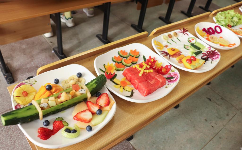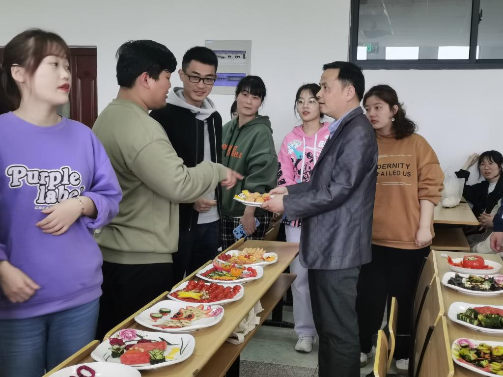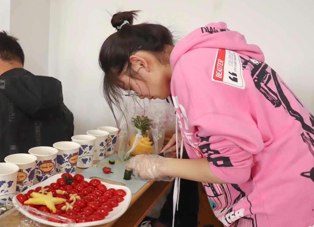 在教室也能做美食?简单食材也能变身精致佳肴展红色精神?4月28日下午,九游·官方网站在E314教室内开展第十二届“厨神入化”大赛,60余名学生组成15支队伍,以“庆祝建党百年,传承红色精神”为主题进行水果拼盘和创意凉菜制作。