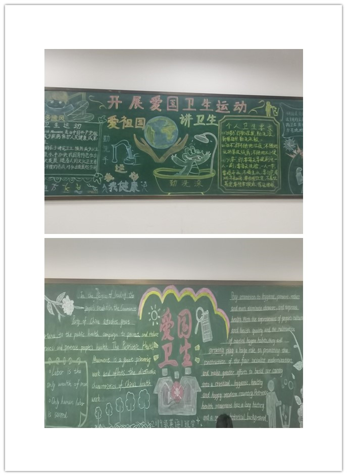 “爱国卫生运动”为主题的黑板报评比活动中,各班级在生活委员的带领下认真收集资料,精心构思版面。同学们绘画绿色地球的卡通形象,清晰地概括出“爱国卫生”的主要内容;设计抗疫主题的典型元素,形象地描述出做好疫情防控的主要措施;罗列真实且具体的数字,直观地说明培养健康的生活方式的重要性。一幅幅创意新颖、主题鲜明的板报,都流露了青年学生对建设健康美丽中国的美好祝愿。2019级英语5班的板报负责人都熠在谈及绘制初衷时说道,“希望这种宣传方式能让同学们了解更多的卫生知识,提高防范疾病的自我保护意识,增强个人体质。”