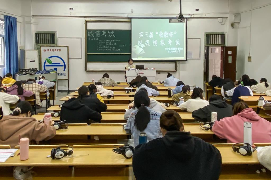 “这次模拟考试听力很棒!”“梦回高三英语测试!”“什么时候能出成绩?”……近日,安庆师范大学大学生英语爱好者协会举办英语四级模拟考试,分别在龙山校区、菱湖校区设置考场,全校2021级和2022级400余名学生报名参加。