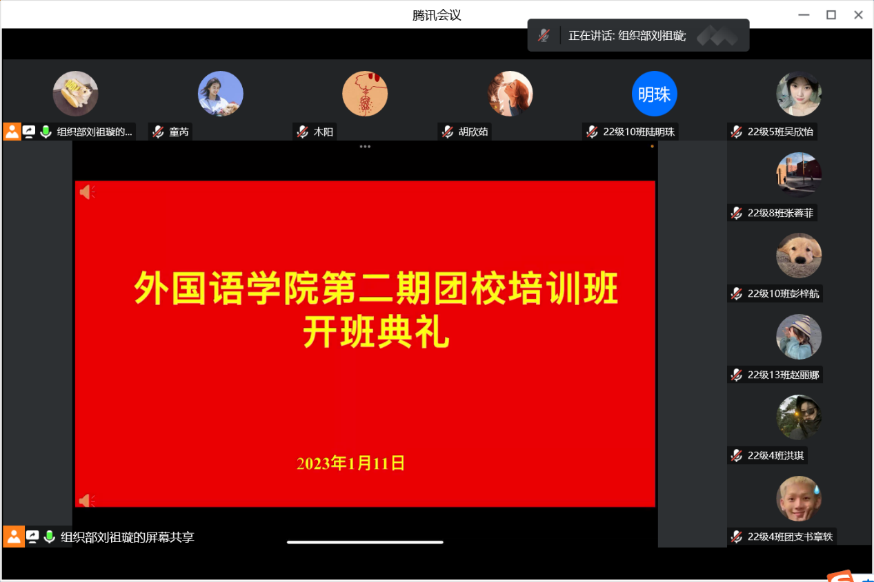 2023年1月11日上午,九游·官方网站第二期团校培训班开班典礼于线上举行,学院团委负责人、本期入团积极分子及2022级新生团支书近50人参会。