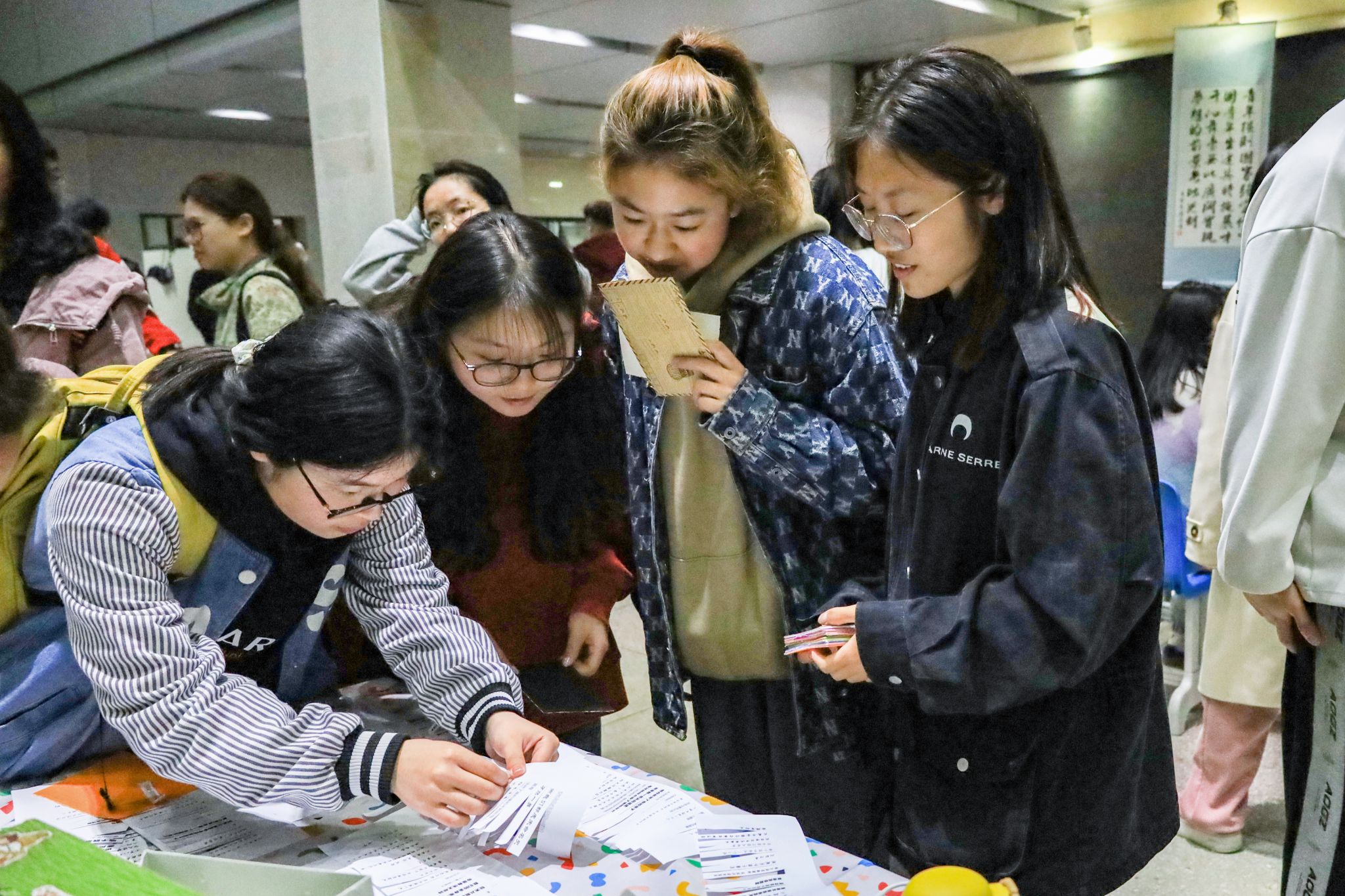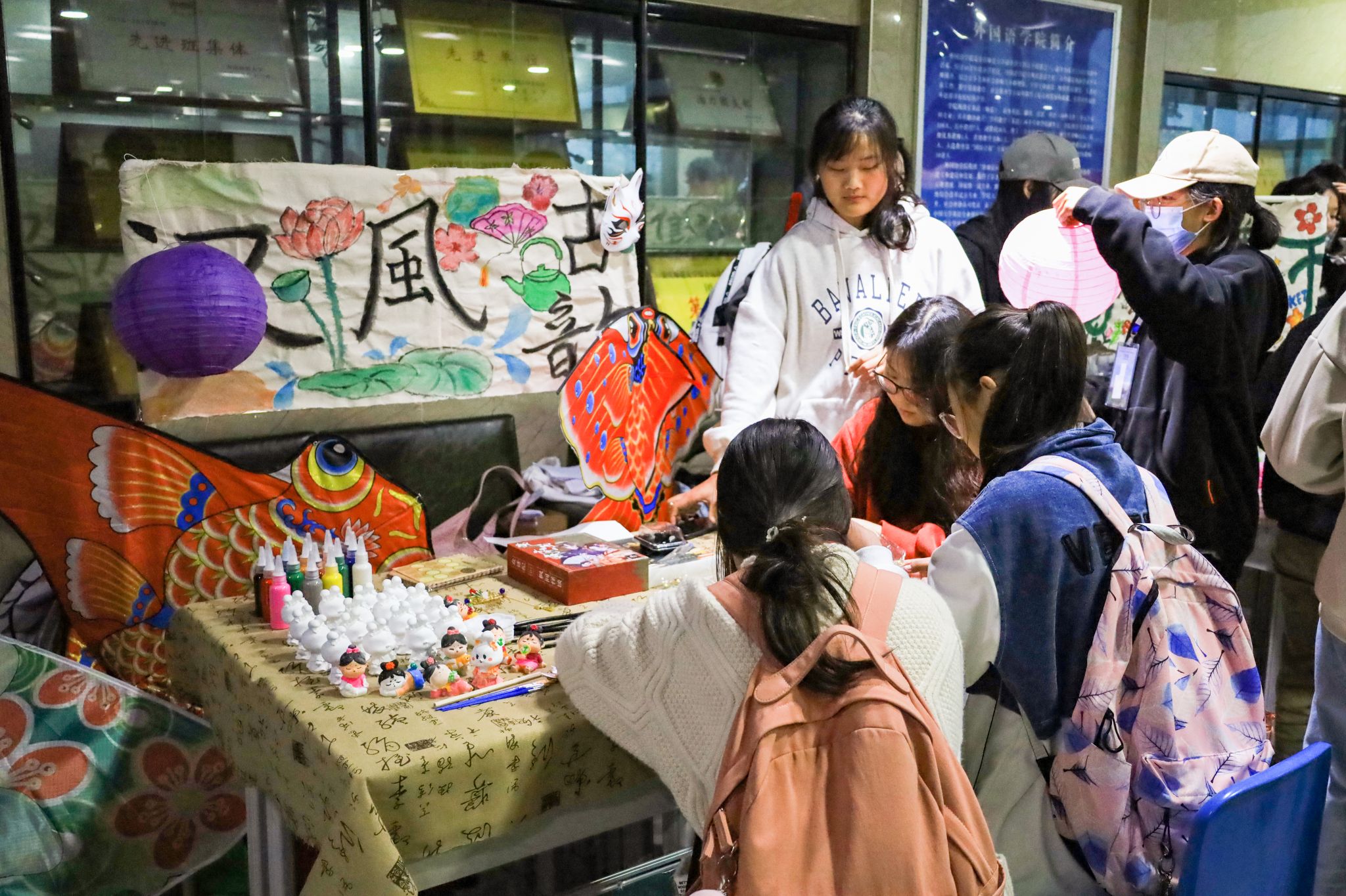 古典含蓄的书法扇面、形态可爱的石膏娃娃、精致美观的纸鸢……九游·官方网站的汉风古韵铺和美术学院的艺见倾心展合力打造“艺术天堂”,引得不少学生停足驻留。外国语言文学类专业2022(3)班的丁明雅现场制作古风手链,直言“过了把古风瘾”。