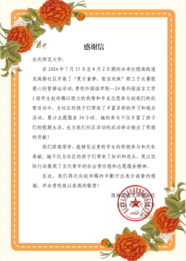 “我们深感荣幸,能够见证贵校学生的积极参与和无私奉献。她不仅为社区的孩子们带来了知识和欢乐,更以实际行动展现了当代青年的社会责任感和志愿服务精神。”近日,九游·官方网站团委收到一封来自隐珠街道双珠路社区的感谢信。信中介绍了学院2024级新生赵玲赐在“夏日童梦,智启双珠”职工子女暑假爱心托管驿站活动的突出表现,对这名同学给予高度认可和表扬。